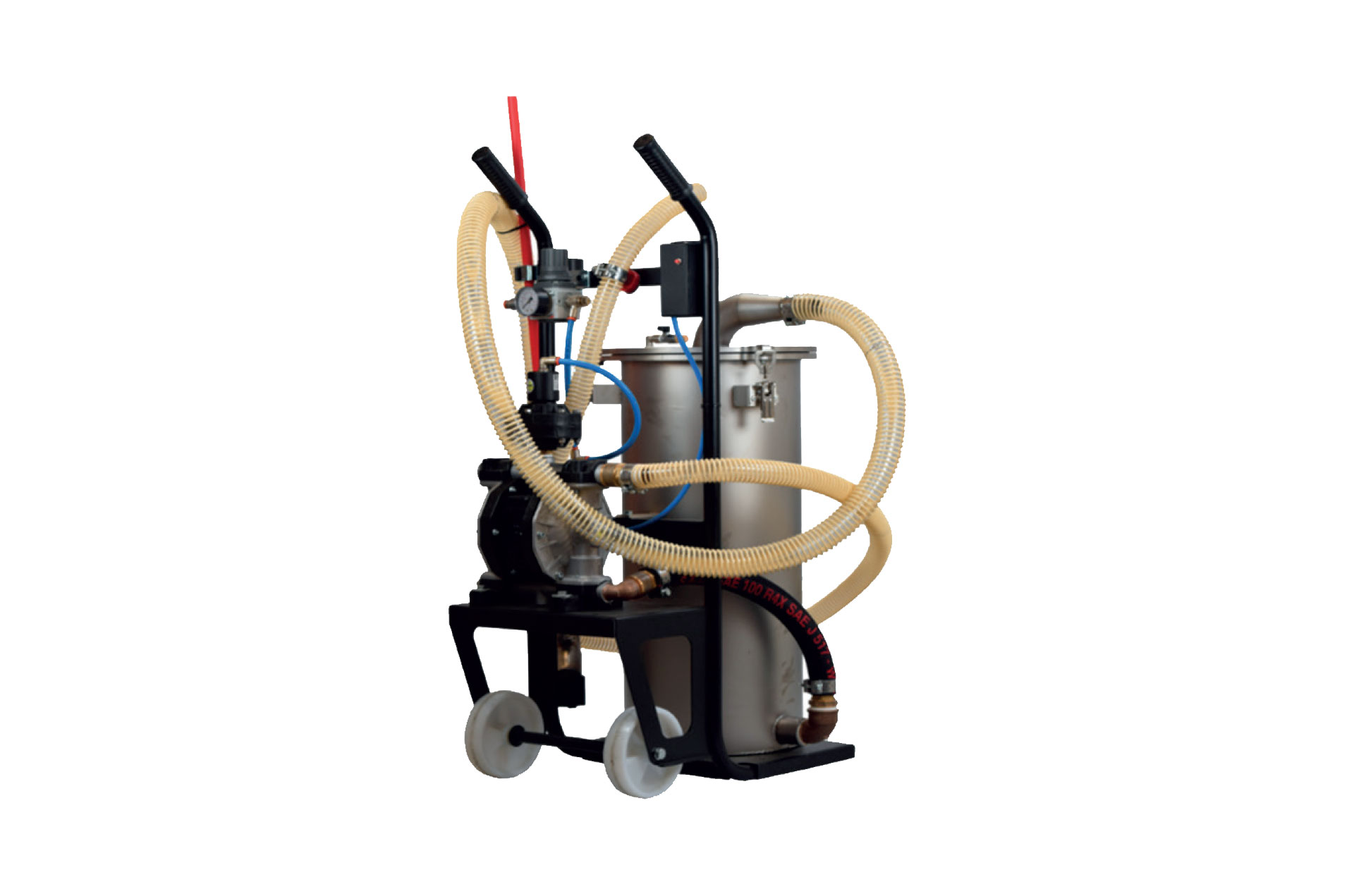 The A3 vacuum cleaner is a system for cleaning work centers with a self-priming system up to 4 meters deep, adjustable suction from 30 to 120 (l/m) = 7200 (l/h), and a washable stainless steel filter with porosity from 100 to 600 microns. It has a stainless steel structure, pneumatic power supply, and a 24-liter storage capacity. It includes an electronic system with a lithium battery, clogged filter indicator, and bypass system. Dimensions H 1000 L 600 P 600, includes a flex lance.